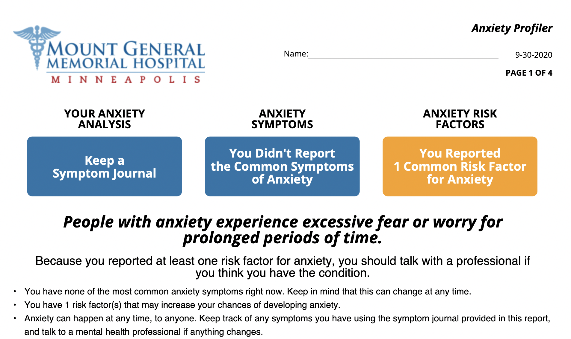 * Example report that an app user would receive via email after completing the assessment: Anxiety Health Risk Assessment Example Report